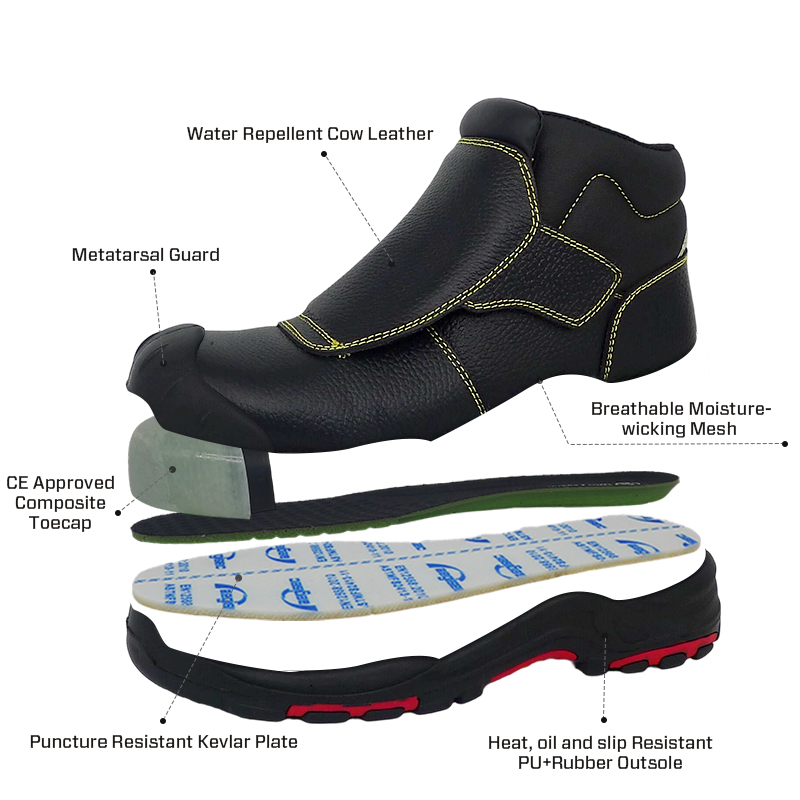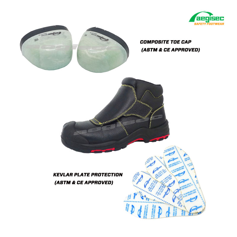 AEGISEC safety work boots is designing for harsh working environments such as mining,welding,smelter and construction. With water resistant, cow leather and metatarsal protection for comfort and durability. The bottes de sécurité de protection métatarsale features a composite toe cap and puncture resistant composite midsole. The heat-resistant outsoles can withstand up to 300°C.