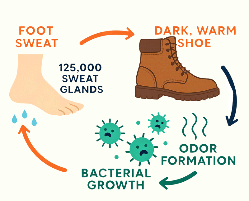 💧Your feet can sweat up to 500 ml per day 💧Heat and moisture get trapped inside work boots 💧Bacteria break down sweat → causing odor